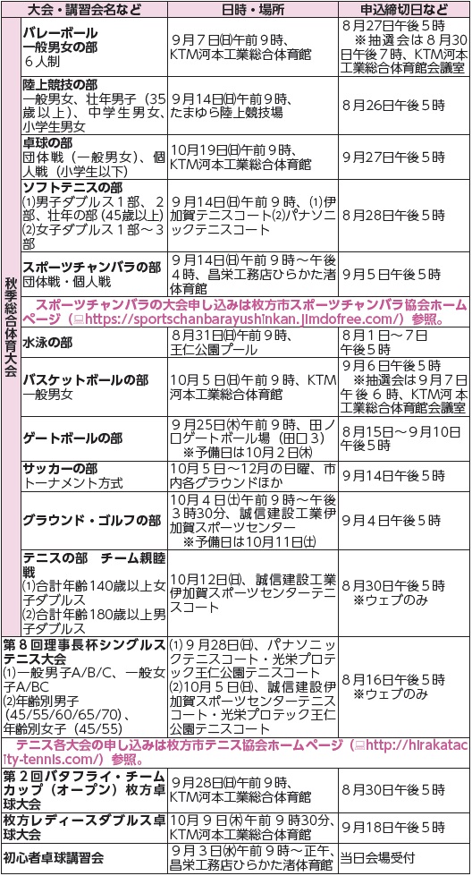スポーツ スポーツ大会・講習会 28/67 前の記事 次の記事 発行日 : 2025年08月01日 自治体名 : 大阪府枚方市 広報紙名 : 広報ひらかた 令和7年8月号 No.1344 申込方法・参加費・対象など詳細は枚方市スポーツ協会へお問い合わせを(月曜、祝日休み)。 問合せ:枚方市スポーツ協会 【電話】898・0200【FAX】898・0201 Tweet シェアする 第49回 新春走ろうかい ひらかたハーフマラソン FCティアモ枚方を応援しよう 市民応援デー