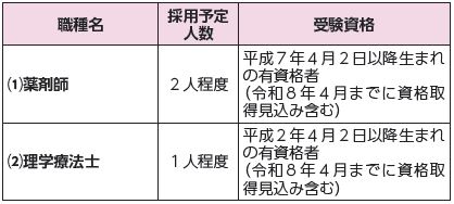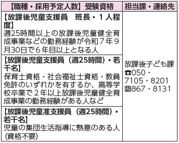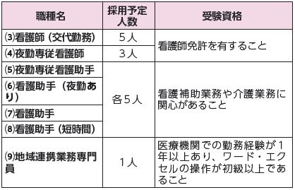 職種は下表の通り。勤務時間、報酬など条件は職種によって異なります。雇用期間は10月1日~来年3月31日(再度任用の場合あり)。資格・免許はいずれも採用日前日までに取得見込みであること。詳細は各募集要項(市ホームページから取り出し可)参照。