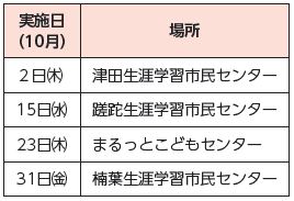 日時など:下表の通り。無料。母子健康手帳・バスタオル持参。当日直接会場へ。