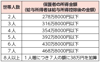 (1)保護者の令和6年中の合計所得が下表の認定基準額以下の世帯。障害者控除を受けている場合は1人につき27万円を所得金額から控除(特別障害者は40万円、同居特別障害者は75万円を控除)