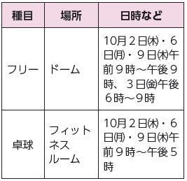日時など:下表のとおり。参加費各200円、60歳以上・中学生以下・障害者100円。室内シューズ・タオル・飲み物持参。運動できる服着用。