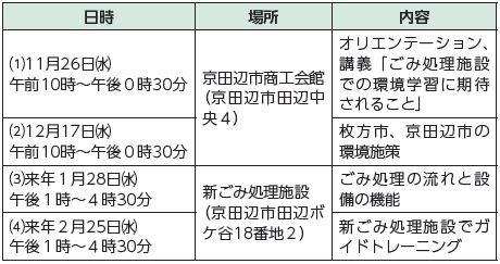 京田辺市と共同で建設している新たな可燃ごみ広域処理施設(来年3月完成予定)で両市域の子どもたちにごみ処理の仕組みを伝える見学案内ボランティアの養成講座。知識やガイド技術を学びます。