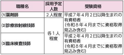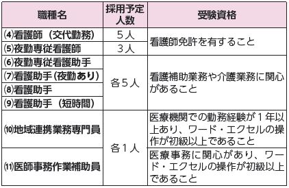 申込:(1)受付中。10月6日まで(2)(3)10月1日~31日まで(4)~(11)随時受け付け。所定の申込書(募集要項とともに同病院ホームページから取り出し可)・必要書類・返信用封筒(住所・氏名を書き110円切手を貼付)を同病院総務課へ。郵送(〒573-1013禁野本町2-14-1。簡易書留郵便に限る)可。複数職種の申し込みは不可。