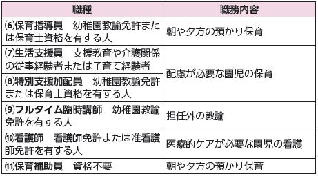 職種は下表の通り。登録期間は3年間。雇用期間は年度内の必要な期間(更新あり)で募集状況に応じて随時案内。勤務場所は(1)~(3)各保育所またはひらかた子ども発達支援センター(4)(5)各保育所(6)~(11)各幼稚園。