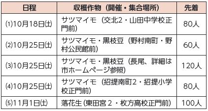 地元農家が丹精こめて育てた野菜を収穫し買い取り。日程は下表の通り。軍手・エコバッグ持参。枝豆ははさみ、イモ類と落花生はスコップも持参。汚れてもよい服着用。雨天時の開催の有無は当日午前8時以降に市ホームページ参照または市コールセンター(【電話】841・1221)で確認を。