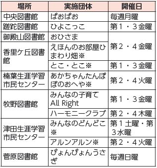 子育て経験のある市民スタッフによる絵本の読み聞かせや手遊びなど。開催日などは下表のとおり。午前10時~午後0時30分(※午前9時30分~正午)。当日直接会場へ。