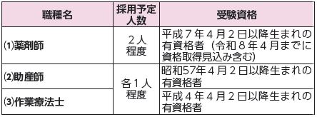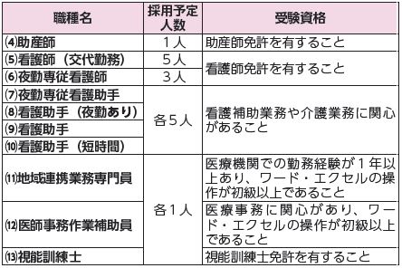 職種は下表のとおり。10月の試験で定員に達すれば募集をしない場合があります。採用は(1)~(3)令和8年4月1日または令和7年度中(4)~(13)令和7年度中。(1)募集中。11月10日まで(2)11月1日~14日まで(3)11月1日~30日まで(4)~(13)随時受け付け。所定の申込書(同病院ホームページから取り出し可)、必要書類、住所・氏名を書き110円切手を貼った返信用封筒を同病院総務課へ。郵送(〒573-1013禁野本町2-14-1。簡易書留郵便に限る)可。複数職種の申し込みは不可。受験資格などの詳細は募集要項参照。