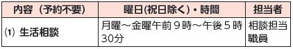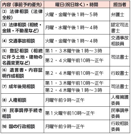 市役所別館5階市民相談コーナー(広聴相談課内)では、担当職員による生活相談をはじめ、専門家による各種相談を受け付けています(予約優先)。詳細は下表のとおり。専用電話(【電話】861・2006)・オンライン相談可。多言語対応も実施。いずれも無料。