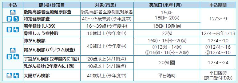 ・(1)70歳以上、(2)生活保護世帯、(3)市民税非課税世帯((3)は事前に市民税の申告と保健医療センターでの申請要)の人は、骨粗しょう症検診、各がん検診、心電図検査、肝炎検査、胃がんリスク検診が無料で受診できます。また、若年健診(U-39)も(2)(3)に該当する人は無料です。