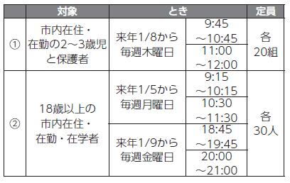 申込み:12月7日(必着)までにWEB申込、ハガキ(必要事項(住所、氏名、年齢、電話番号、日時、内容)・市外在住者のみ勤務先を記入)で〒567-8505 スポーツ推進課【電話】620・1608