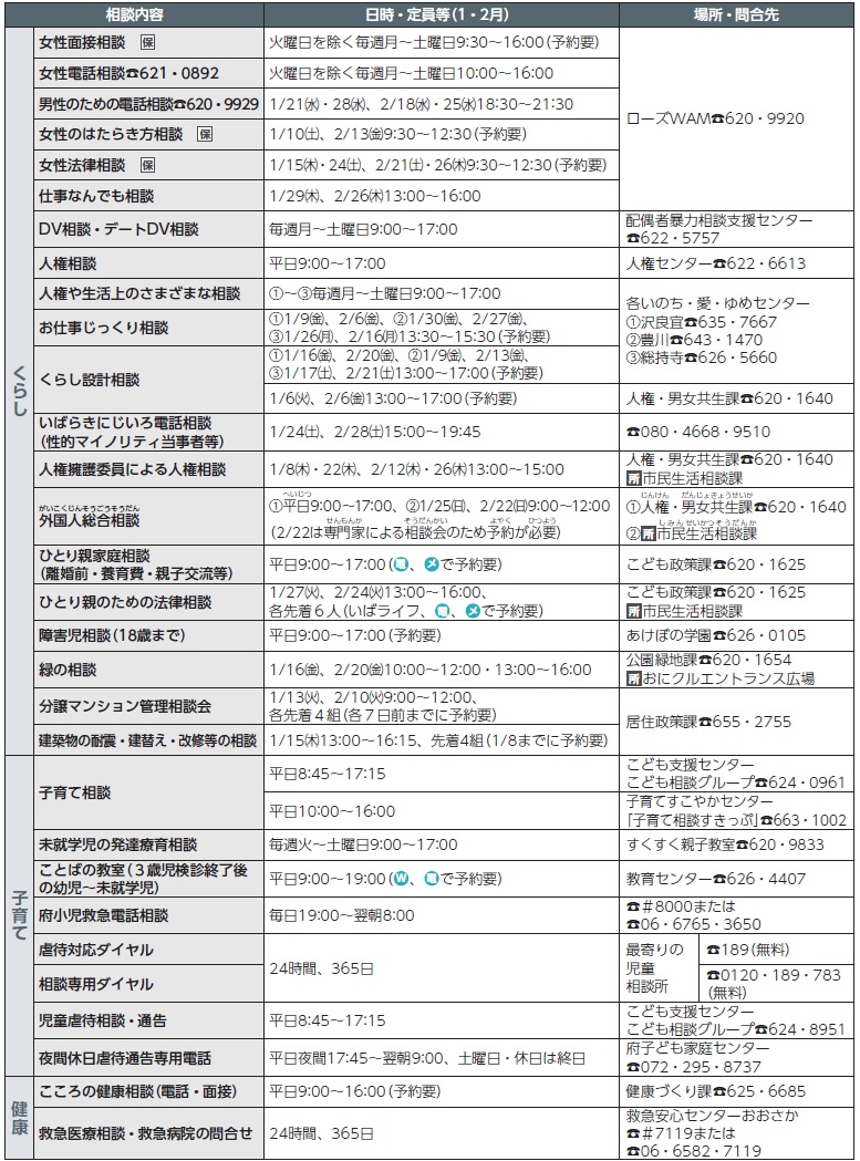年末年始・祝日は実施しません。また、下表に掲載のない無料相談については市HPまたは先月号の広報いばらきをご確認ください。