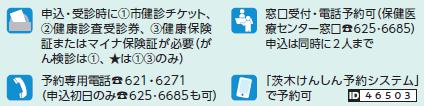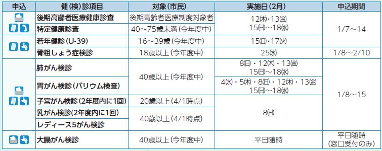 ・(1)70歳以上、(2)生活保護世帯、(3)市民税非課税世帯((3)は事前に市民税の申告と保健医療センターでの申請要)の人は、骨粗しょう症検診、各がん検診、心電図検査、肝炎検査、胃がんリスク検診が無料で受診できます。また、若年健診(U-39)も(2)(3)に該当する人は無料です。
