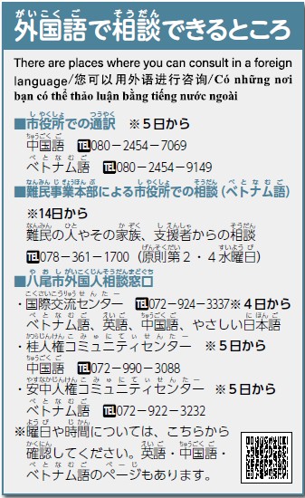 くらし 外国語(がいこくご)で相談(そうだん)できるところ 26/41 前の記事 次の記事 発行日 : 2025年12月20日 自治体名 : 大阪府八尾市 広報紙名 : やお市政だより 令和8年1月号 Tweet シェアする 〔Notice from the Yao city〕相談 〔Childcare Information〕子育て