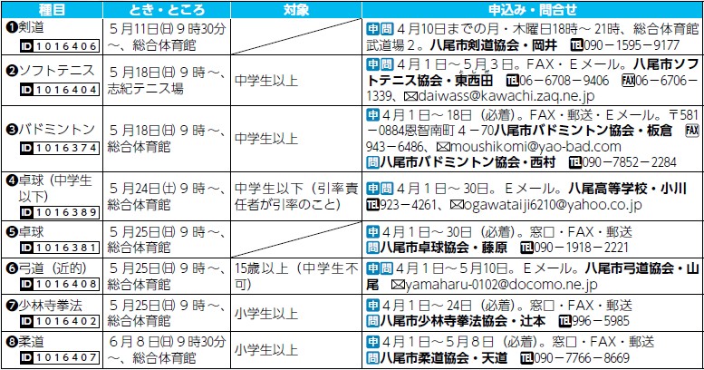 申込み・問合せ:(4)(6)以外は申込書。(3)(5)(7)(8)は〒581-0006 清水町1-1-6 八尾商工会議所会館内・文化・スポーツ振興課