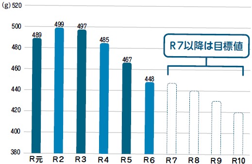 本市では、令和10年度までに「家庭から出るごみを1人1日当たり420g」に減らすことを目標としています。令和元年度の489gと比較すると、約70gの削減が必要です。70gはバナナ1/2本、リンゴ1/4個程度です。まずはできることから始めてみましょう!