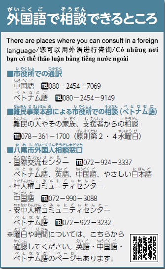 くらし 外国語(がいこくご)で相談(そうだん)できるところ 30/44 前の記事 次の記事 発行日 : 2025年09月20日 自治体名 : 大阪府八尾市 広報紙名 : やお市政だより 令和7年10月号 Tweet シェアする 〔Notice from the Yao city〕相談 〔Childcare Information〕子育て