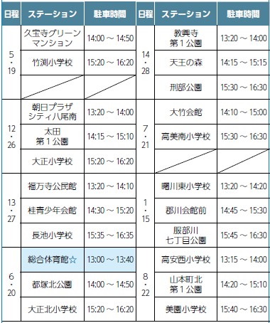 ☆6日の総合体育館への巡回は南小阪合公園へ場所を変更しています。