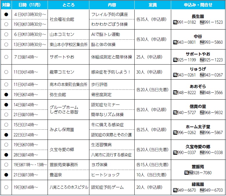 講座 介護予防の教室 28/53 前の記事 次の記事 発行日 : 2025年10月20日 自治体名 : 大阪府八尾市 広報紙名 : やお市政だより 令和7年11月号 申込み:11月4日〜 ●印は家族介護教室 ID:1020291 対象:市内在住の介護者 ○印は介護予防教室 ID:1020293 対象:市内在住の65歳以上 Tweet シェアする ひゅーまんフェスタ 〔Notice from the Yao city〕イベント・講座(4)