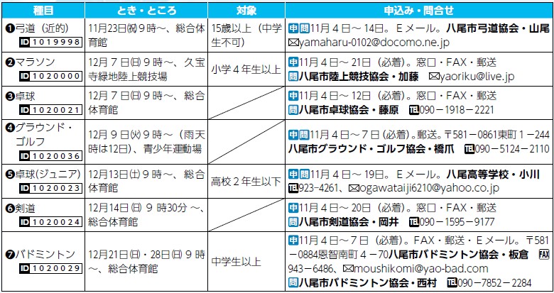 申込み・問合せ:(1)(5)以外は申込書。(2)(3)(6)は〒581-0006 清水町1-1-6 八尾商工会議所会館内・文化・スポーツ振興課