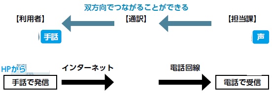 聴覚や発話に困難のある人がスマホやパソコンなどを利用し、手話通訳オペレーターが通訳する「電話リレーサービス」を使用して、手話で市役所へ電話をかけることができるサービスです。
