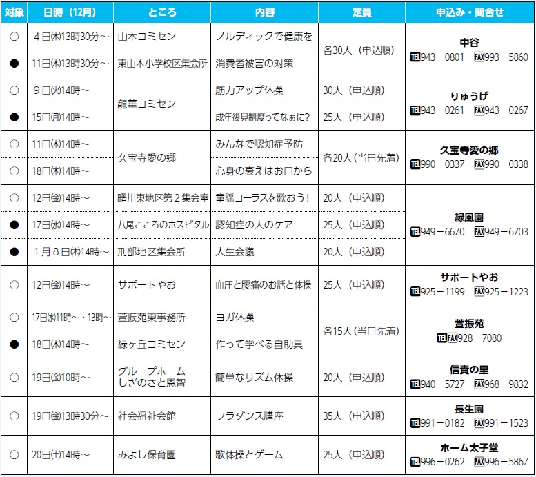 講座 介護予防の教室 28/48 前の記事 次の記事 発行日 : 2025年11月20日 自治体名 : 大阪府八尾市 広報紙名 : やお市政だより 令和7年12月号 申込み:12月1日〜 ○印は介護予防教室 ID:1020874 対象:市内在住の65歳以上 ●印は家族介護教室 ID:1020873 対象:市内在住の介護者 Tweet シェアする 〔Notice from the Yao city〕イベント・講座(3) 〔Notice from the Yao city〕スポーツ