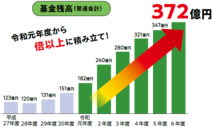 小・中学校を始め建物などの更新・改修や、災害対応など不測の事態の備えとして、基金への積み立てを行っています。