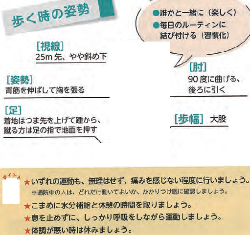 「インターバル速歩」と呼ばれる「ややきついと感じる速歩」と「ゆっくり歩き」を3分おきに交互に行う方法(1日5セット、週4回以上を目標)は筋力維持や転倒予防にも効果的。誰でも無理なく取り組める、おすすめの運動です!
