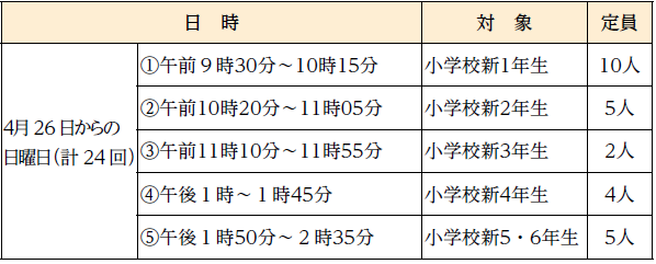 ※いずれも申込順(5人未満のときは中止)。クラスは申込数によって前後の合同クラスになるときがあります。