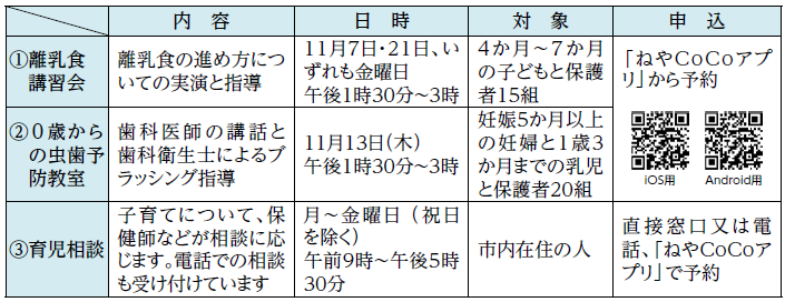 申込み・問合せ:10月22日(水)までに「ねやCoCoアプリ」で子育て支援課