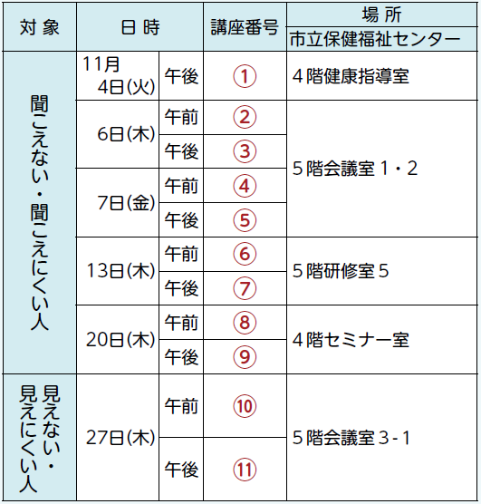 その他:手話通訳を行います(申込時に予約)。スマートフォン、筆記用具が必要(スマートフォンを持っていない人には貸し出します)