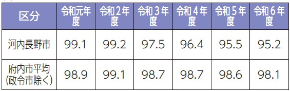 (注)この表は、各年4月1日現在の一般行政職の職員の給料について、国家公務員を100とした場合の比較です。