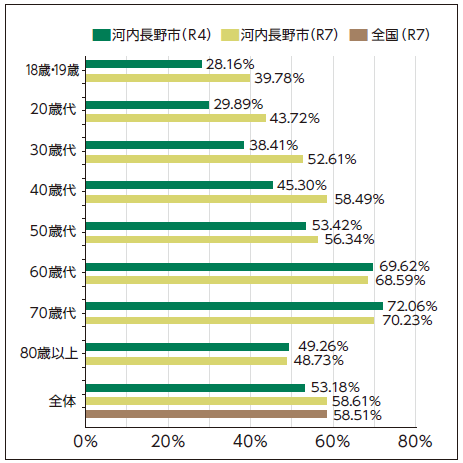 全国投票率(選挙区選挙)は、前回投票率を6.46ポイント上回り、58.51%となりました。一方、本市の状況は、前回の市投票率を5.43ポイント上回り、58.61%となっています。若年層の投票率が相対的に低く、年齢層が上がるにつれて基本的に高くなるという傾向はこれまでと同じですが、今回注目すべきは、18歳・19歳から40歳代までの各世代の投票率が前回を10ポイント以上上回っている点です。