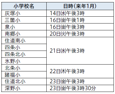 持物:くつ袋、筆記用具、スリッパ、就学届(来年1月31日までに学校に提出も可)