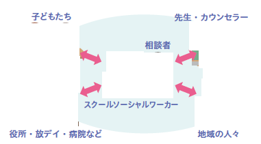 スクールソーシャルワーカーは、保護者や児童生徒、学校、地域の皆さんなどと連携して子育ての困り事を解決する手伝いをします。公立小学校には週1回勤務、公立中学校は派遣型で関わっている他、ネウボラ事業などとも連携しながら、幅広いサポートを行っています。まずは気軽に相談してください。