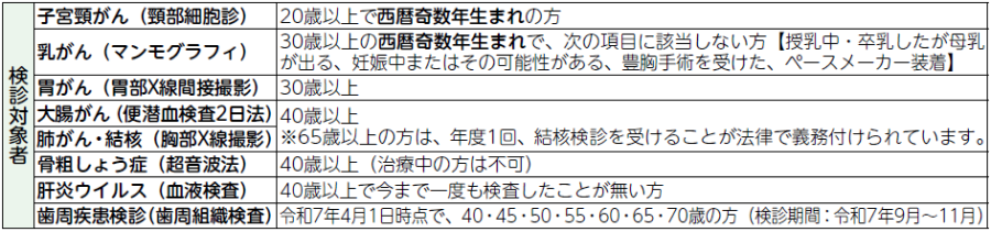 がん検診については、集団検診か個別検診のどちらか一方で、年度1回(乳がん・子宮頸がんは2年に1回)受診可。骨粗しょう症検診は集団検診のみ。※年齢は令和8年3月31日時点です。