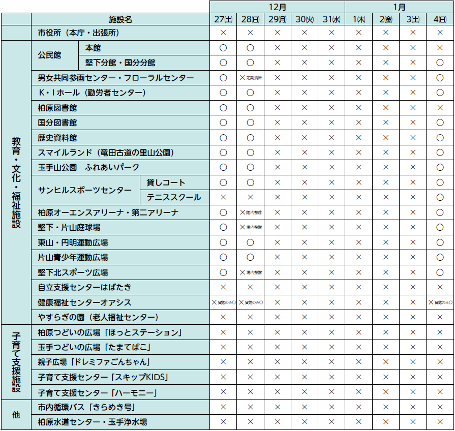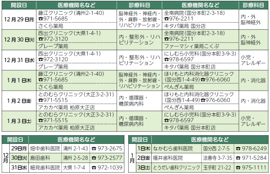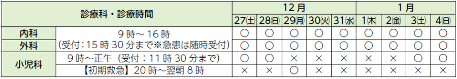 ※診療費は休日加算料金になります。また、以下の診療予定以外は、従来どおりの救急体制をとっています。令和8年1月5日(月)から通常診療です。