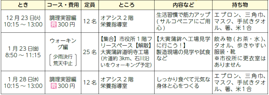 申込み・問合せ:12月1日(月)8時45分~ウェブサイトまたは、電話で健康づくり課