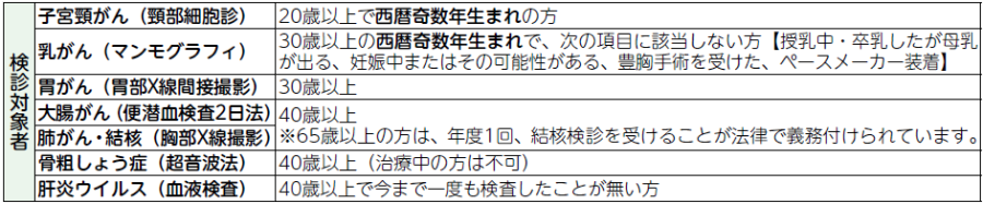 がん検診については、集団検診か個別検診のどちらか一方で、年度1回(乳がん・子宮頸がんは2年に1回)受診可。骨粗しょう症検診は集団検診のみ。※年齢は令和8年3月31日時点です。