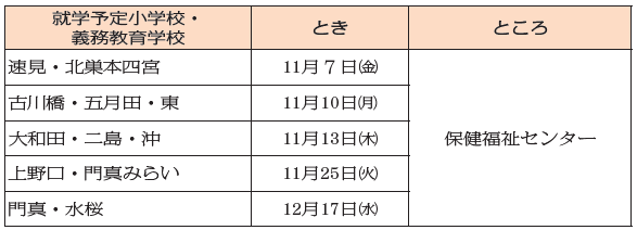 持ち物:就学時健康診断予診票、就学時健康診断票、母子手帳