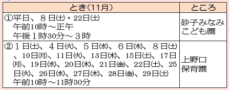 ※(1)雨天時のみ予約制、砂子みなみこども園へ電話