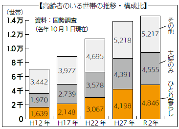 市の高齢者のいる世帯数は増加しています。国勢調査によると、令和2年ではひとり暮らし世帯が4千846世帯(高齢者のいる世帯の33·2%)となっており、年々増加していることが分かります(上表)。