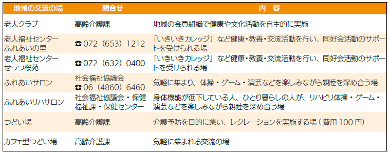 市では、どなたでも気軽に参加できるイベントを多数用意しています(下表参照)。趣味の集いへの参加や自治会の活動を通じて、役割を見つけ、生きがいを見つける人もいます。