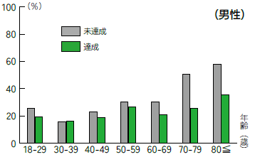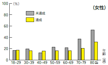 この目安の達成状況とフレイル該当者の割合を年代別に見てみると(図2)、男女ともに年齢が高くなるほど、目安の未達成者でフレイルに該当する人の割合が多くなる傾向が見られました。特に70歳以上では、達成者と未達成者の差が約20%まで広がっていました。