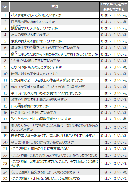 まずは、厚生労働省作成の基本チェックリストでフレイルに該当するか確認してみましょう。今回の調査では、身体的・精神的・社会的な3つの側面から、全部で25項目の質問を行いました。合計8点以上でフレイルに該当すると判定しています。自身の健康状態を知るためにも、ぜひチェックしてみてください。