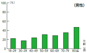 その一方で、最も少ない割合は男性では30歳代、女性では40歳代となっており、それよりも若い世代の方がフレイル該当者の割合が多い結果となりました。