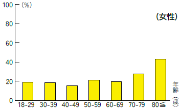 まず、年代別にフレイル該当者の割合を見てみると(図1)、男女ともに50歳代でわずかに割合が増えるものの、全体的に年齢が高くなるにつれてフレイル該当者の割合も増えていることが分かります。