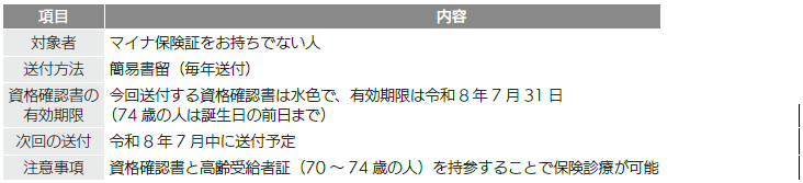 国民健康保険被保険者証(保険証)は令和6年12月1日をもって新規発行を終了しました。以降、マイナ保険証(健康保険証の利用登録済マイナンバーカード)をお持ちの人には「資格情報のお知らせ」、マイナ保険証を登録していない人やマイナンバーカード未作成の人には「資格確認書」を交付しています。有効期限が令和7年10月31日までの被保険者証または資格確認書を持つ人には、10月中旬以降、世帯主宛に順次発送します。なお、世帯内でマイナ保険証の利用状況が異なる場合は別々に送付します。