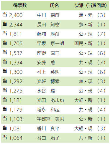 ※小数点以下が生じているのは、「按分票」によるものです。「按分」とは、同一氏名や姓・名の候補者が複数いる場合、該当票を各候補者の得票割合に応じて分配する仕組みで、公職選挙法で規定されています