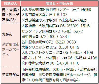 申込み:11/5(水)までに、封書またははがき(一人1枚)に、(1)希望プラン(午前または午後)、オプション申込内容(2)希望健診日(第1・第2希望)(3)氏名(ふりがな)(4)生年月日(5)住所(6)電話番号(7)40歳以上はご加入の保険者(名称)・受診券整理番号を書いて、〒566-0021 南千里丘5-30 保健センター健診申込係へ(必着・抽選)
