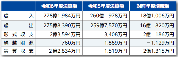 令和6年度一般会計決算は、財政調整基金(貯金)を取り崩すことなく、2億2,834万円の黒字となりました。